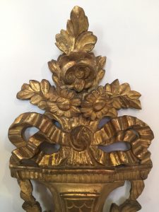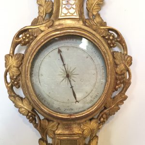 Baromètre d’époque Louis XVI à grappes et feuilles de raisin, sur les côtés les guirlandes de feuilles de vigne encadrent le baromètre principal et remontent jusqu’au noeud de passementerie d’où partent des feuilles de lauriers et d’acanthe qui encadrent des fleurs de marguerite.Le bas est occupé par un thermomètre qui est soutenu par des nuages.