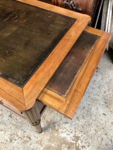 Bureau plat d’époque Louis XVI en bois naturel ouvrant à cinq tiroirs et deux tirettes a restaurer.