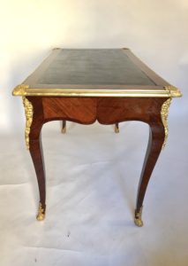 Une lingotière entoure le dessus , dans les angles des agrafes  à figures de chimères , une emboîture en frisage de bois de violette et en son centre un cuir noir d’origine. Les montants sont galbés garnis de bronzes à têtes de dieux grecs  et des sabots aux pieds à feuilles d’acanthe