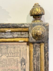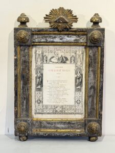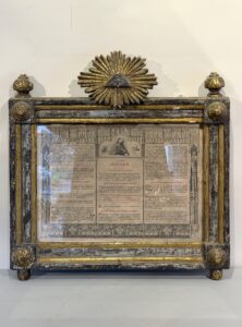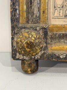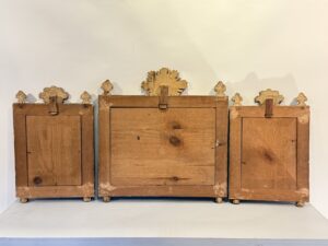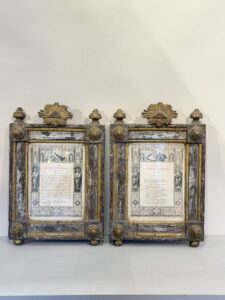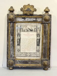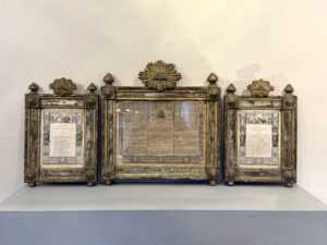 A church altarpiece, placed on the altar during Mass, was adorned with engravings from the Gospels, such as the Sacrum Convivium, Sacerdos, and Initium. Luminous deltas, representing balance, truth, and light, are enthroned at the top of the frames. The rectangular frames, with medallions in the corners, rounded feet, and finials, are partially gilded and silvered.