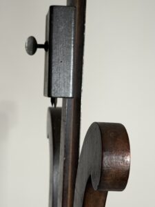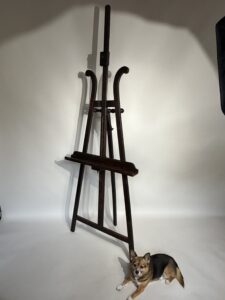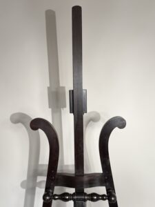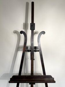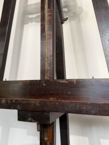 It features three adjustment systems: one allows the shelf supporting the paintings to be raised or lowered (this system uses a metal rack and pinion mechanism, disengaged with a pull tab); the second secures the paintings by sliding them along the dovetailed upright; and the third, located at the rear, adjusts the leg’s orientation. This leg is centered on a turned wooden section, ensuring overall stability and locking in place with a threaded rod and wing nut. It has a beautiful original patina.