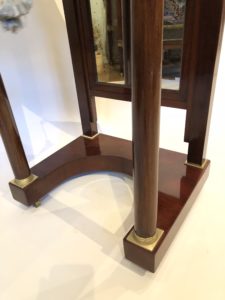 Coiffeuse en acajou d’epoque du début du XIX éme siècle, avec à l’avant des colonnes flanquées de bronzes, la base est concave pour recevoir les pieds lorsque l’on est assis devant et le haut est en marbre bleu turquin enchâssé dans une moulure en bois et derrière un miroir coulisse de bas en haut et s’oriente.