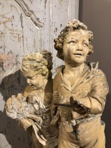 Ce groupe est composé d’un garçon et d’une petite fille tenant dans ses bras un caniche.