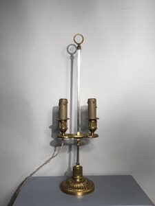 The base is guilloché on the exterior contour, the widest part is gadrooned, on the rounded edge a frieze of water leaves and in its center a round shaft with fine grooves from which comes the square metal rod which supports the on the top are the lighting bobeches, which slide and are locked by a screw with a decorative head in the shape of a simplified flower of lysis, a round socket is located at the top of the square rod for moving the object.