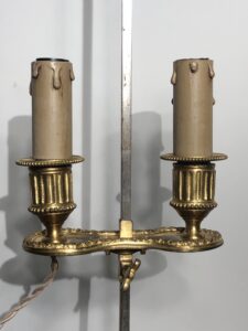 Lampe bouillotte en bronze doré et fer de style Louis XVI à deux lumières.