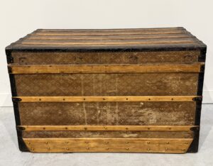 The trunk has undergone some alterations, such as the removal of the interior canvas and the reinforcements on the back.
