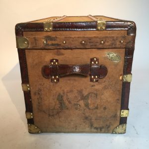 Malle de voyage de la marque Moynat en cuir pour les angles, renforcés de protections en laiton qui sont pour les cions bas marqués Moynat.