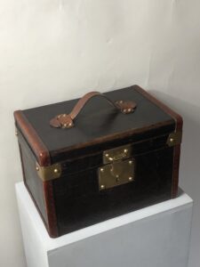 Malle de voyage en bois recouverte de cuir, des coins en laiton et sa serrure d’époque, fabriquée vers 1880/1900 à Lyon par les Etablissements J. BERNE.