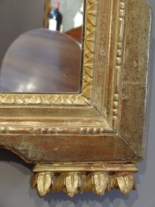 Miroir en bois doré à l’or d’origine du sud, région d’Avignon, avec sa guirlande de feuilles de laurier et un faisan aux ailles déployées, le cadre se présente avec une moulure sculptées de feuilles d’eau, de perles et de congés avec dans son bas un décrochement et des denticules représentant des feuilles de laurier.