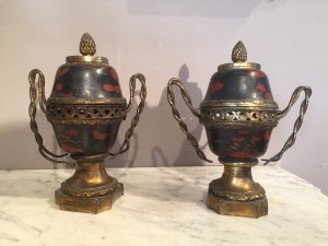 Paire de brûle-parfum en bois laqué à décors chinoisant et laiton/bronze doré, des ajournements dans la partie haute du vase sont de formes rondes, une pomme de pin sur le haut du couvercle et des anses en formes de serpents.