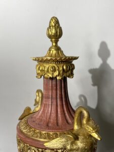 The cassolettes are decorated with swans on each side. They are decorated with friezes and acanthus leaf motifs on their base.