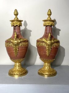 Pair of marble and bronze cassolettes, Louis XVI Directoire style, 19th century.