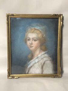 Pastel portrait of a young woman’s bust, in the 18th century style.