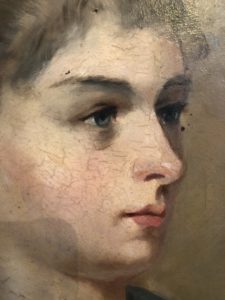 Portrait d’une jeune femme. Portrait d’une adolescente des années 1880/1900. Peinture sur papier marouflé sur carton. Cadre d’origine. Cet objet est vendu.