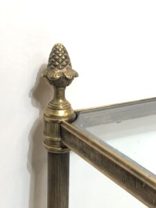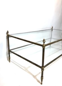 Table basse peut-être de la maison Jansen de style Louis XVI à deux plateaux en verre transparent, le décor des traverses est striées verticalement, les montants sont ronds avec de larges bagues, des pieds fuseaux et des pommes de pin en haut en décoration.