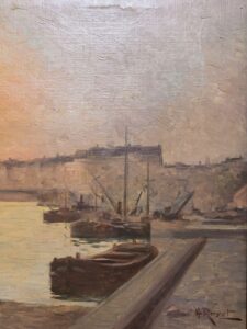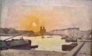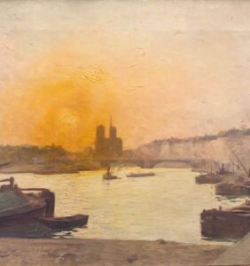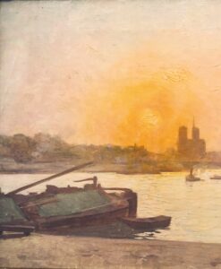 Tableau de Henri ROYET 1850-1918, représentant une vue de Paris au soleil couchant sur la Seine et au fond la cathédrale Notre-Dame.