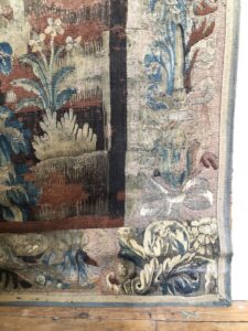 Cette tapisserie est encadrée d’une bordure composée de grands neouds de passementeries, de feuilles d’acanthe en enroulements, des cartouches peut-être héraldiques.