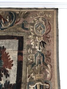This tapestry is framed by a border made up of large knots of trimmings, winding acanthus leaves, perhaps heraldic cartouches.