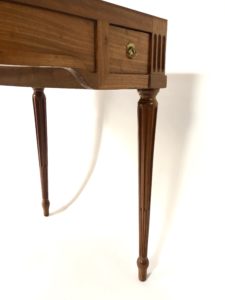 Dessus amovible, d’un côté cuir pour servir de bureau de l’autre côté feutrine pour jouer aux cartes. Pieds fuseaux à cannelures rudentées, traverses droites avec un léger décroché dans la partie longue.